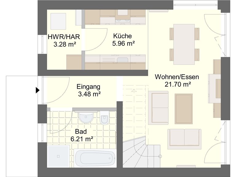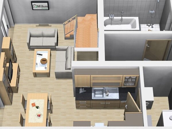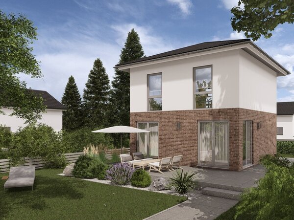 Trotz der kompakten Größe des Hauses bietet es ausreichend Platz für alle Bewohner und ermöglicht ein komfortables und funktionales Wohnen auf zwei Ebenen.