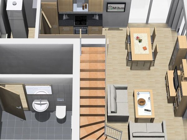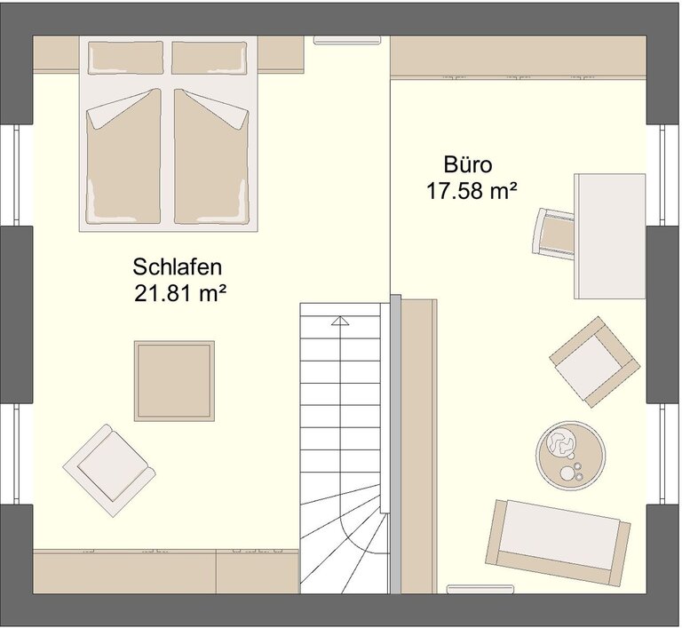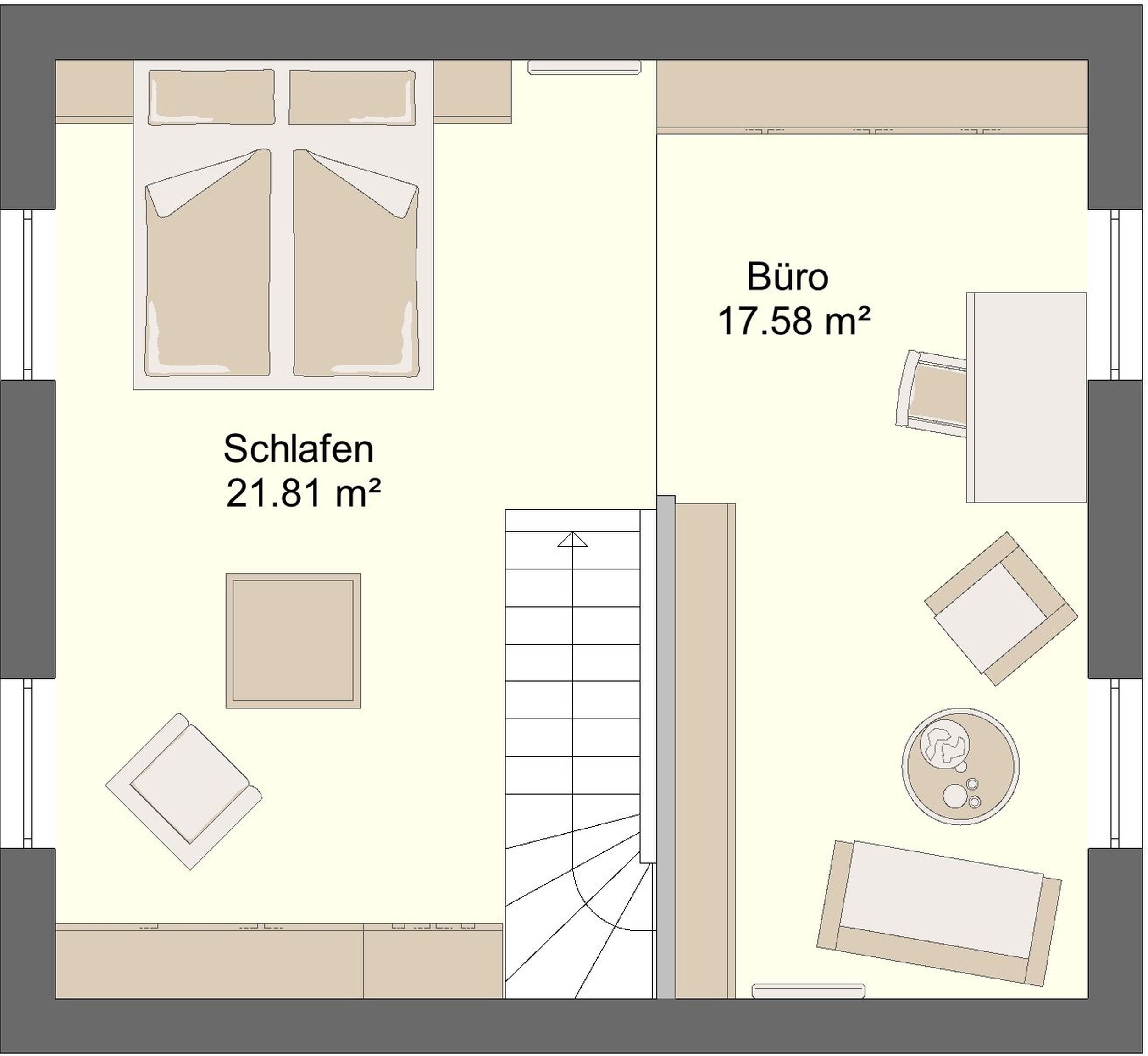 Die Gestaltung im Erdgeschoss schafft eine einladende und kommunikative Wohnfläche, während das Dachgeschoss vielseitige Nutzungsmöglichkeiten bietet.